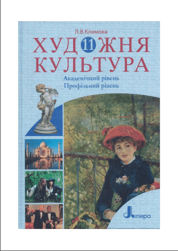 Підручник «Художня культура» для 11 класу, автор Климова, допомагає школярам ознайомитися з основами мистецтва, культурними традиціями та історією художніх напрямів. Книга містить ілюстрації, аналіз творів мистецтва, приклади художніх технік та завдання для закріплення знань. Підручник структурований за темами, що робить його зручним для підготовки до уроків, творчих проєктів і самостійного вивчення. Він сприяє розвитку естетичного смаку, критичного мислення та творчих здібностей школярів.